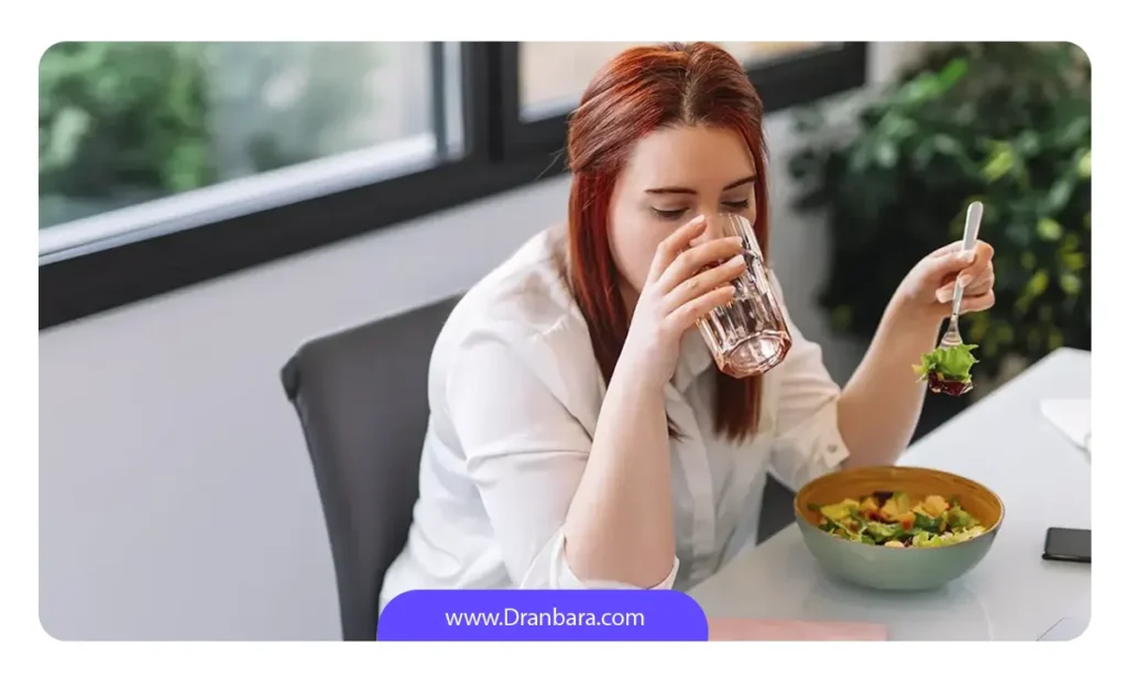 نوشیدن مایعات همراه با غذا یا بلافاصله بعد از آن | رعایت فاصله حداقل ۳۰ دقیقه ای بین خوردن و نوشیدن |