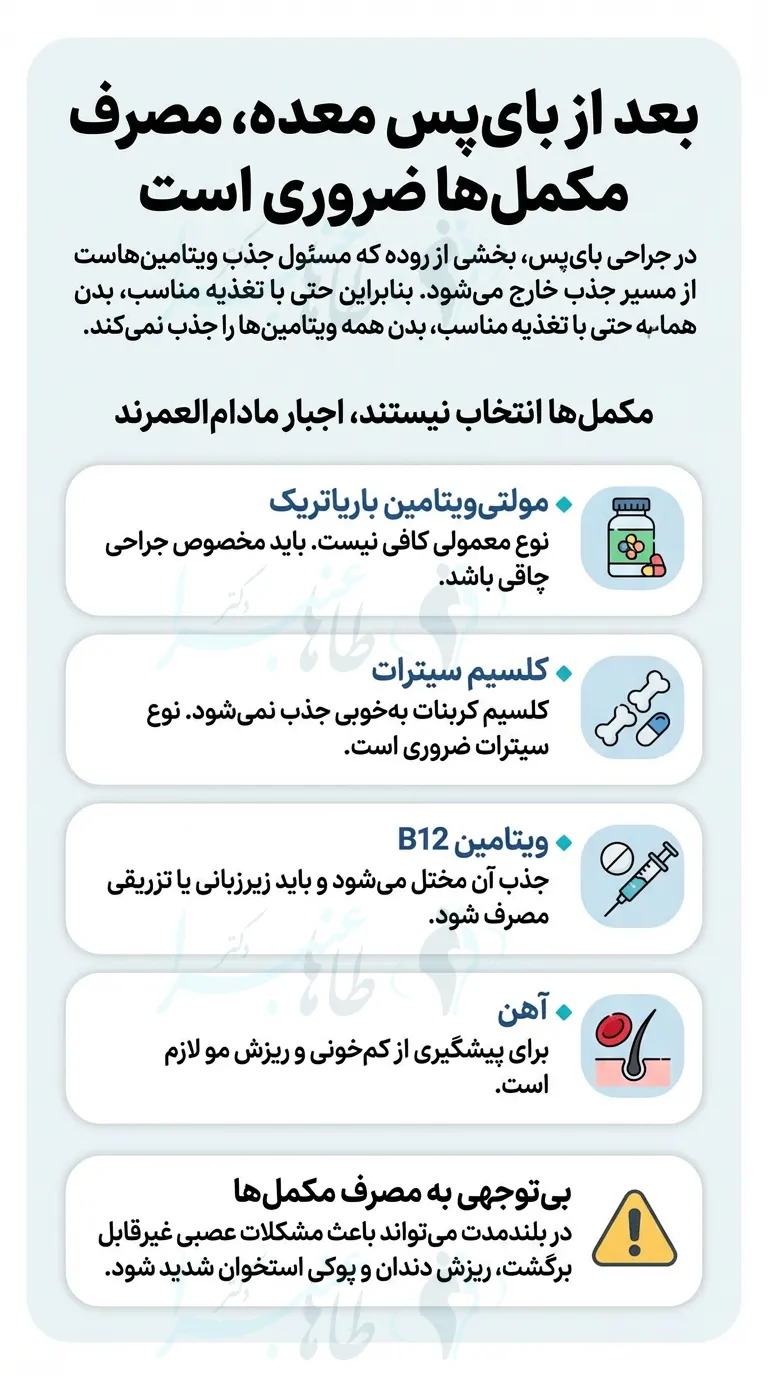 در عمل بای پس، بخشی از روده که مسئول جذب بسیاری از ویتامین هاست، از مسیر گوارش خارج میشود. این یعنی حتی اگر بهترین غذاها را بخورید، باز هم بدن تان تمام ویتامین ها را جذب نمی کند. بنابراین، مصرف مکمل در مراقبت های بعد از بای پس معده یک گزینه نیست، یک اجبار مادام العمر است.